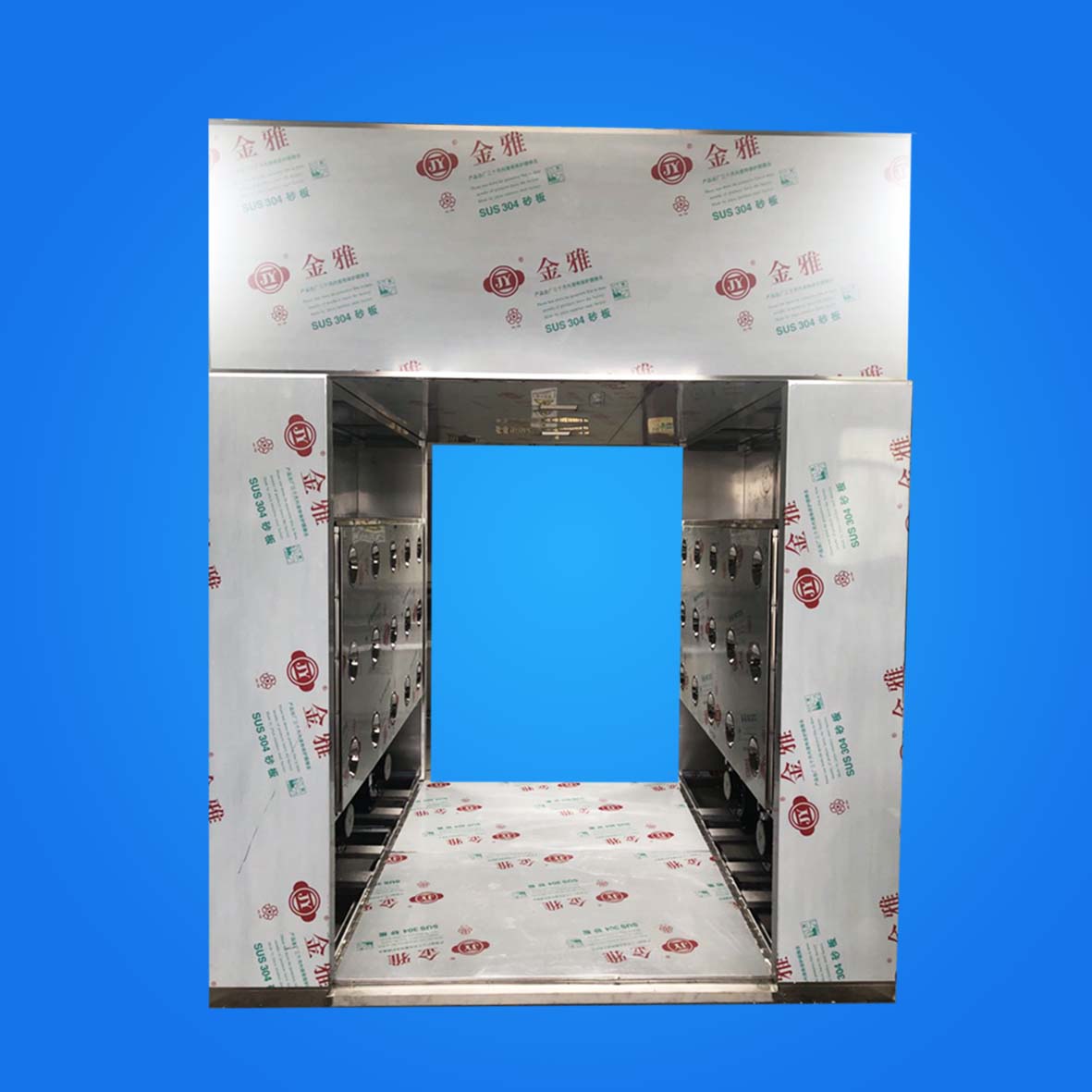 简述: 锈钢风淋室是人员进入洁净室无尘车间所必备的净化设备,通用性强, 可与所有的洁净室和洁净厂房配套使用.工作人员进入车间时,必须通过风淋门, 用强劲洁净的空气,由可旋转喷嘴从各个方向喷射至人身上,有效而迅速清除去 附着在衣服上的灰尘、头发、发屑等杂物. 风淋门可以减少人进出洁净室所带来的污染问题。